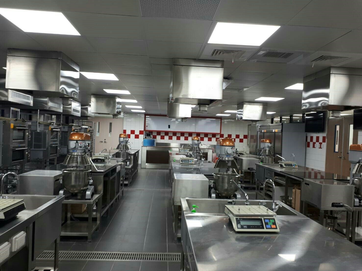 工欲善其事必先利其器~給您TOP1上課環境(即測即評考場)設備:工作檯、蒸氣烤箱、攪拌機 、桌上型攪拌機、冷凍冰箱、冷藏冰箱、急速冷凍、丹麥機、壓麵機、切麵機、電磁爐、水果低溫風乾機、拉糖機、三環爐、平底煎鍋。